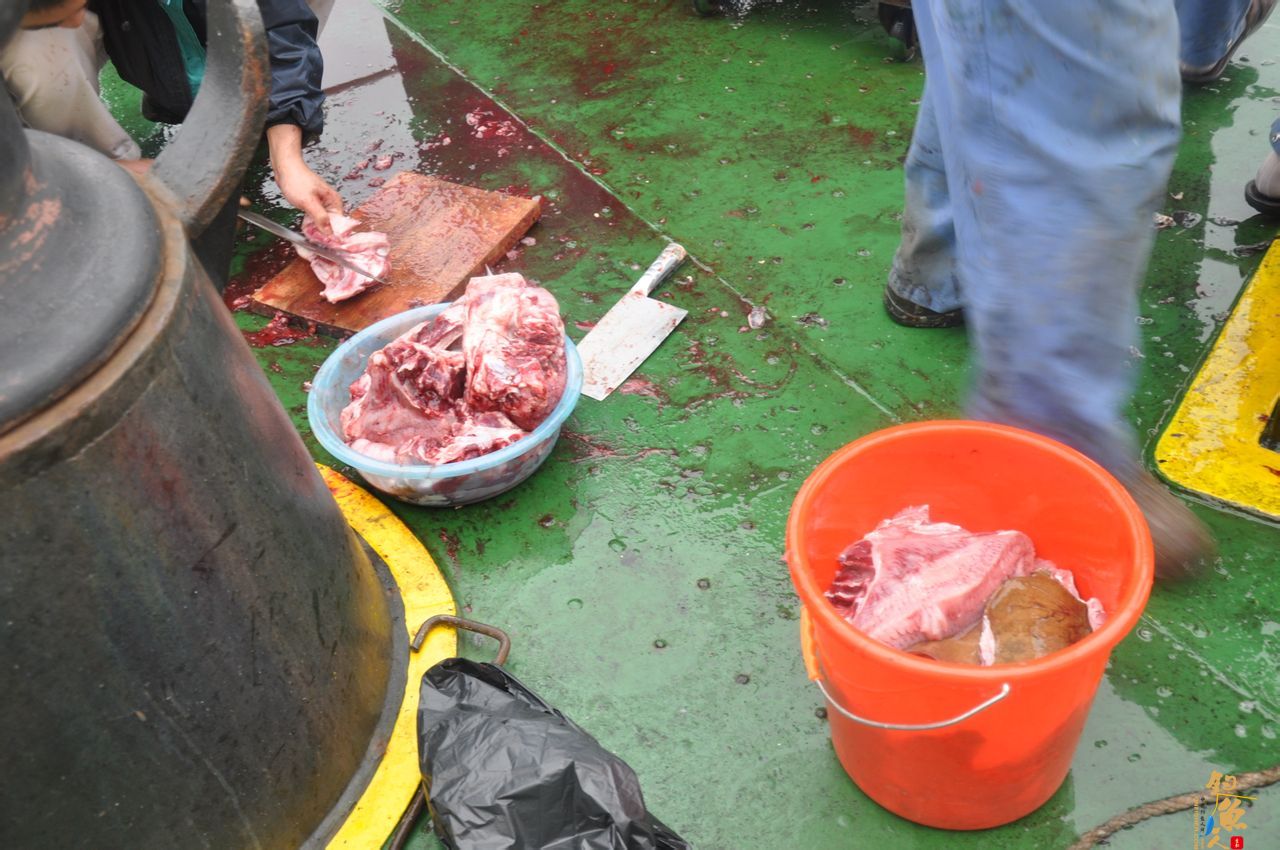 鱼肉这桶子满满一桶再加一脸盆。这种鱼全身基本都是软骨,船员用它来煲汤,那个腥啊,我是爱吃鱼的人,尝了一口之后硬是再也不敢尝第二口。