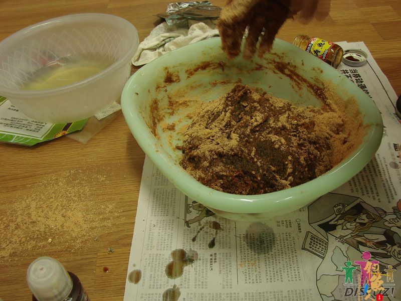 将干粉分两次倒进湿昆布丝里面,倒进去马上用手顺时针搅拌至完全渗入昆布丝里面