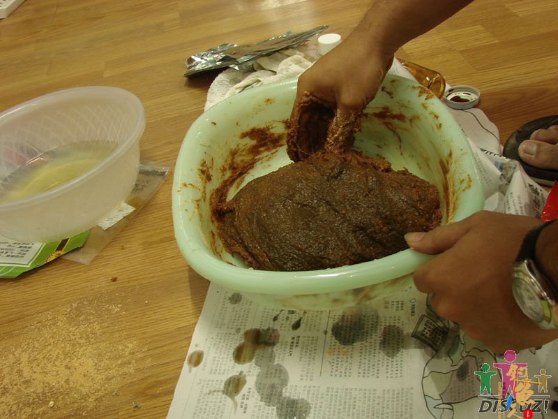 经过两次的加干粉,初步搅拌后就变成下图的状态,大家还可以看出红色的虾粉和黑色的昆布丝还没完全均匀,还需要继续搅拌均匀为止,注意这时候搅拌一定要按同一方向(我喜欢顺时针)**搅拌,否则很容易断丝,功夫就白费了!