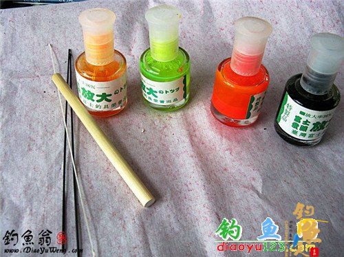 材料的准备:南荻(要求园、直)、漂尾漆(红、橙黄、绿、黑)、白乳胶、漂尾(玻纤帮)、漂脚(碳纤棒)。