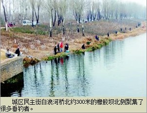 “给鱼儿们留点活路吧,哪有这么垂钓的!”12月15日,不少市民来电反映,城区民主街白浪河桥北约300米的橡胶坝北侧附近近几天一下子涌来大批垂钓者。据该段白浪河景区的保安介绍,由于垂钓的人太多,根本没人听从管理,他们已向上级部门反映,在此也呼吁市民共同保护景区生态。