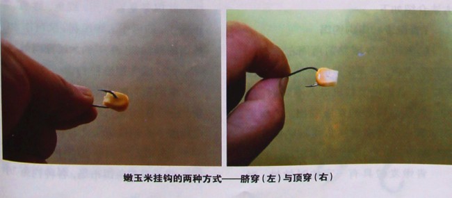2) 、挂饵时,用小刀把玉米粒削下来,钩从玉米的脐部横穿过去,直达到钩的弯部,钩尖要外露长些,小心不要把玉米弄烂,不然抛投时要甩落。