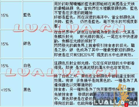 人们对顏色有很多误解,尤其是对鱼所能看得见的顏色究竟有多少种这个问题,误解更多。在这裡,我们只谈在垂钓方面產生实际效果的顏色的应用,并将之限制為9种可在自然界中找到的色彩,这些色彩為红、紫、橙、黄、青、蓝、银、白和黑。以正為从拟饵应用的歷史中,及各种不同清晰度的水域,从水底长时期观察各种顏色所得之发现。