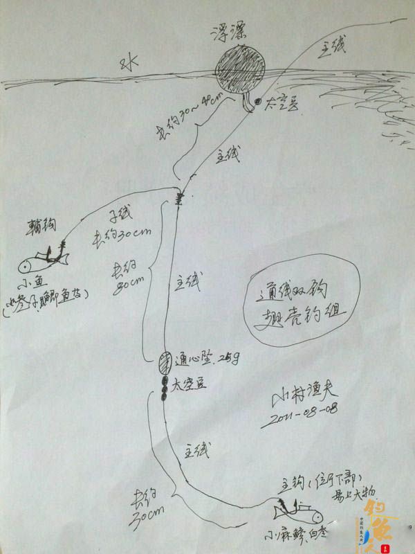B 辅钩子线长30cm、辅钩捆绑处距坠子80cm,而主钩上小鱼饵拖不动25g坠子、鱼线上浮的高度最多也只能30cm,故两个鱼饵不会相互碰线、最多辅钩上鱼饵绕着主线打圈圈;辅钩子线长度30cm+坠前鱼线长度30cm<辅钩捆绑处距坠子80cm,道理如此;