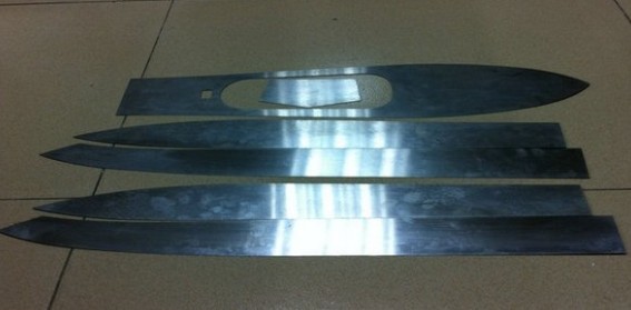 图纸设计完毕,接着是开料,用剪好的图纸贴在0。6MM厚的不锈钢上,用剪板机和沙轮机弄出和图纸一样的长条。