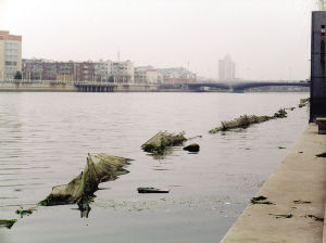 现场看到,所谓的地笼是渔网的一种,用竹竿和丝网扎成,鱼虾进去后很难再出来。在刘庄浮桥往光华桥方向,距离西岸两米多远的河面上,铺设着约20多米长的地笼渔网。地笼大部分沉在水下,只有一点露出水面,因此从河面上看不出里面是否有鱼,只是偶尔露出比较多的地方,可以看到一两条小鱼。