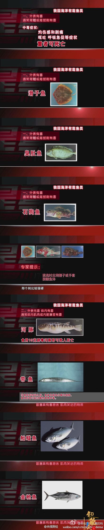 #是真的吗#【如何鉴别有毒鱼类?】有毒海鱼分为以下几种:1,外表有毒,通常背鳍部或尾部刺有毒。中毒后会产生、灼伤、呼吸急促等症状,严重时会导致死亡;2,体内肌肉、内脏有毒。还有一些常见鱼类当死亡时间过久时体内会产生组胺,食用后会产生过敏性食物中毒。