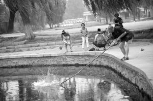 不少市民到万柳塘公园捞死鱼 有人要拿到市场去卖