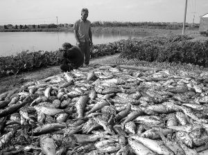 昨天下午,现代快报记者来到王开来承包的鱼塘,在几十米开外就已经闻到阵阵恶臭。岸边堆满了死鱼,有些已经开始腐烂,数不清的苍蝇叮在上面。水塘的一角,漂满了白花花的死鱼。