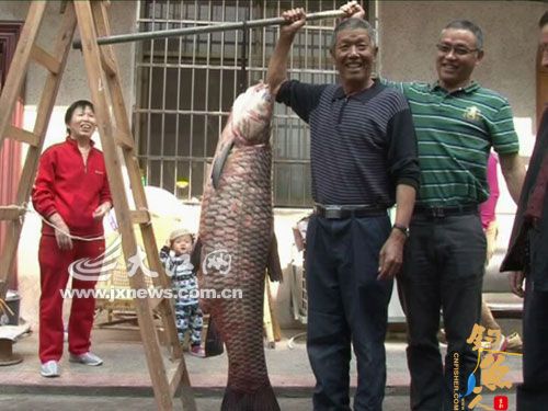 26日上午9时许,记者赶到现场看到,那条大青鱼如“巨人”般躺在袁长牙家的院子里,前来参观的居民络绎不绝。只见这条大青鱼嘴张开如一只碗,一个成人的拳头都可以放进去,而鱼鳞就和鸡蛋差不多大小。经测量,这条大青鱼的重量达75斤,长达1.46米。众人将青鱼用竹竿抬起架在梯子上,与身高1.72米的袁长牙老人相比,长长的大青鱼达到他的下巴处。