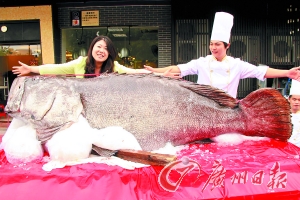 11月9日下午,一条长2.65米、重683斤的巨型石斑鱼现身大朗,引来不少好奇的市民围观。
