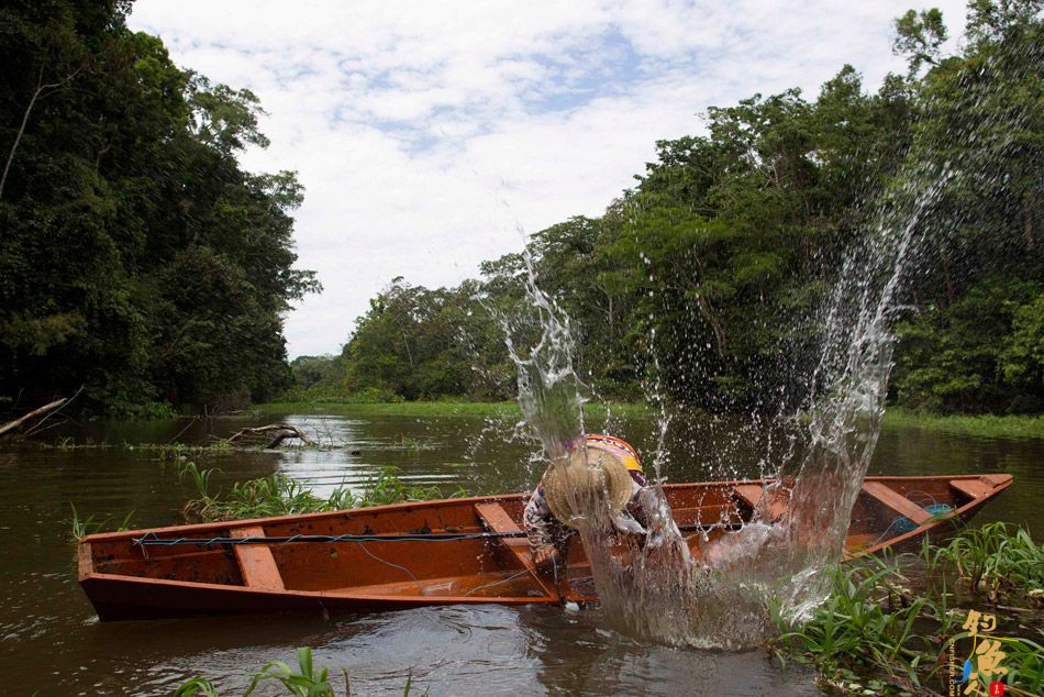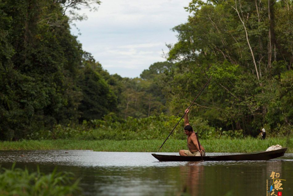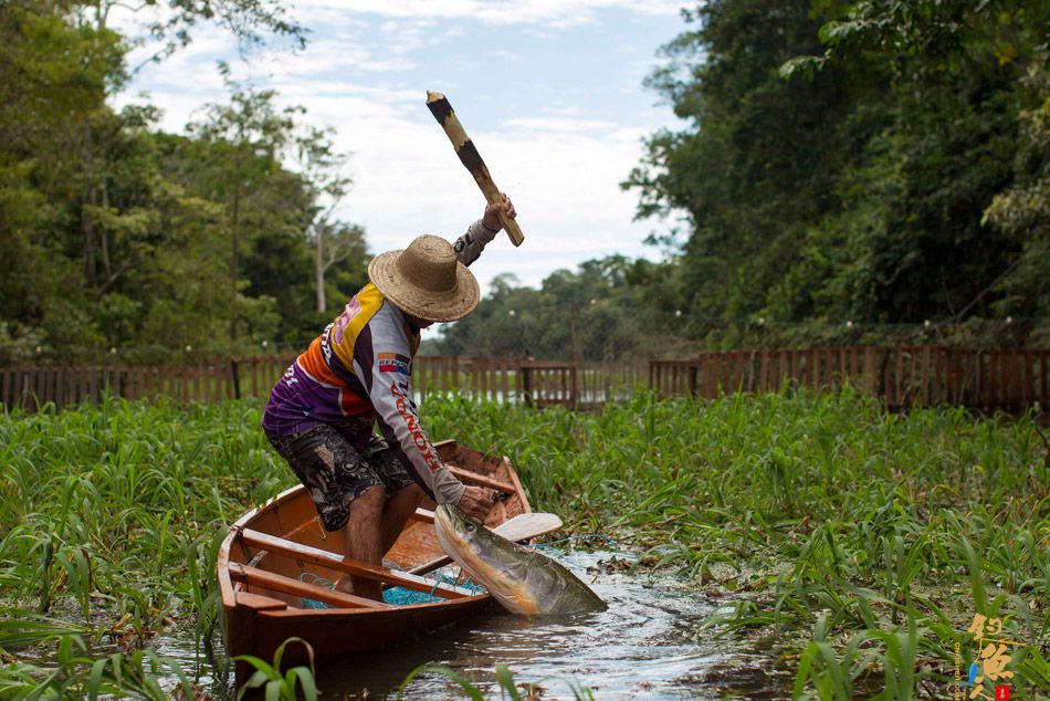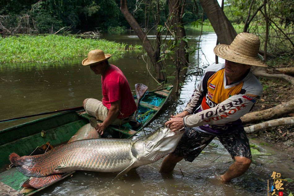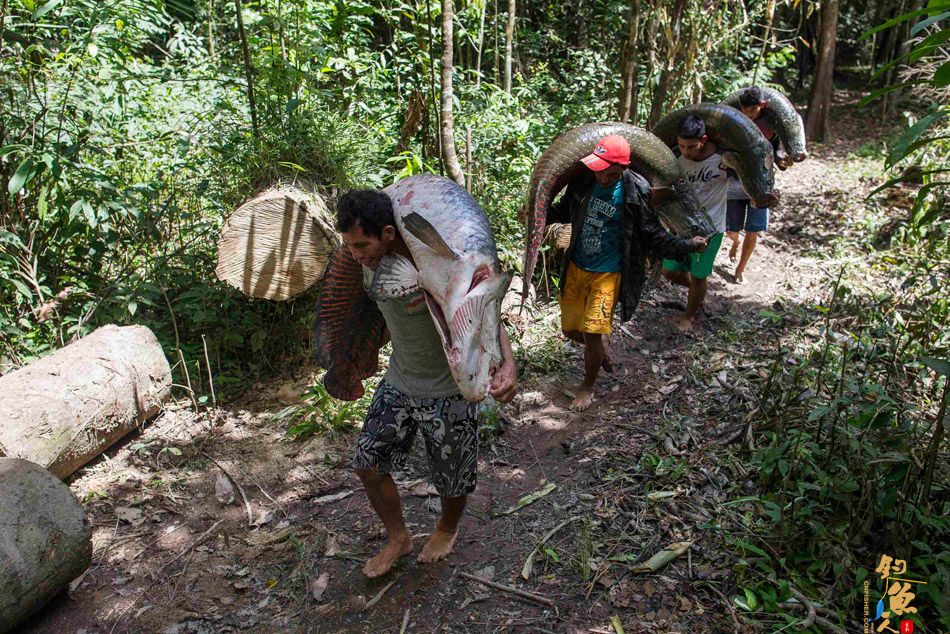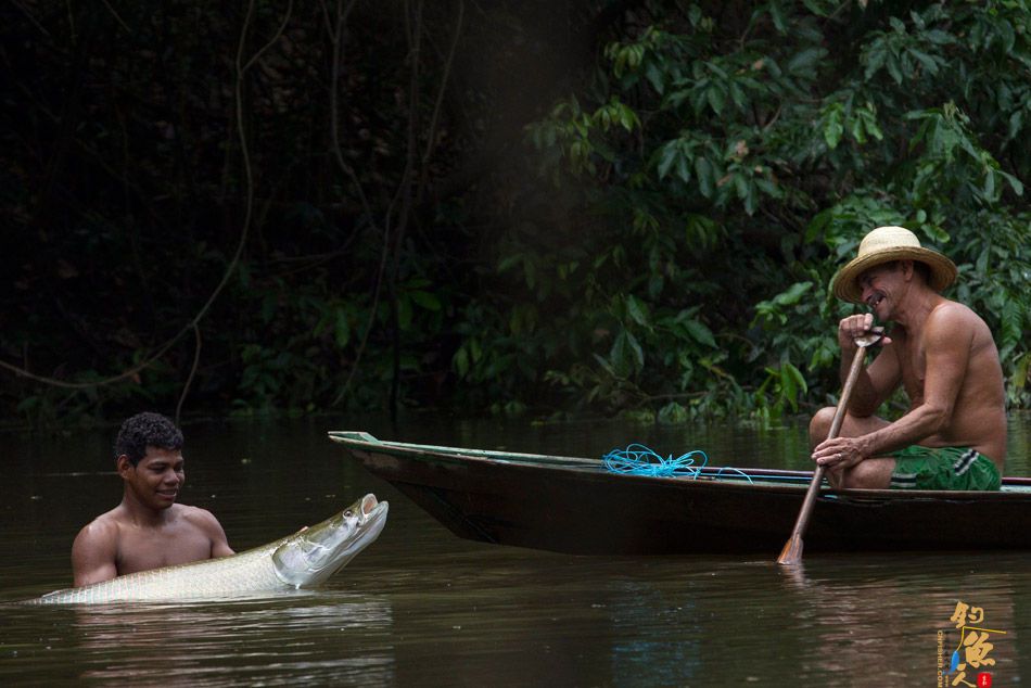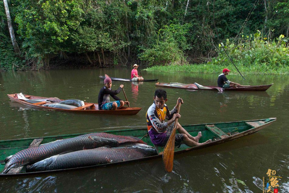 马米拉亚自然保护区的伯克-福多湖,伯托-诺沃村的村民将一条身躯巨大的巨滑舌鱼装上小渔船。伯克-福多湖位于索利蒙伊斯河的一条支流一带,后者是亚马逊河的主要支流。