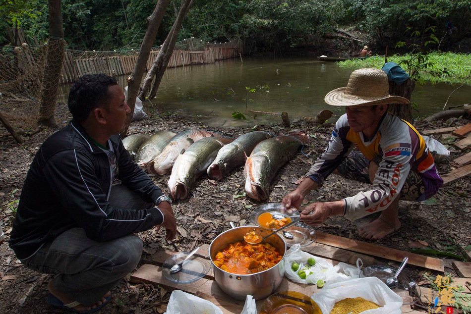 马米拉亚自然保护区,卢马奥岛村民安图纳斯和索扎正在享用美味的巨滑舌鱼肉。