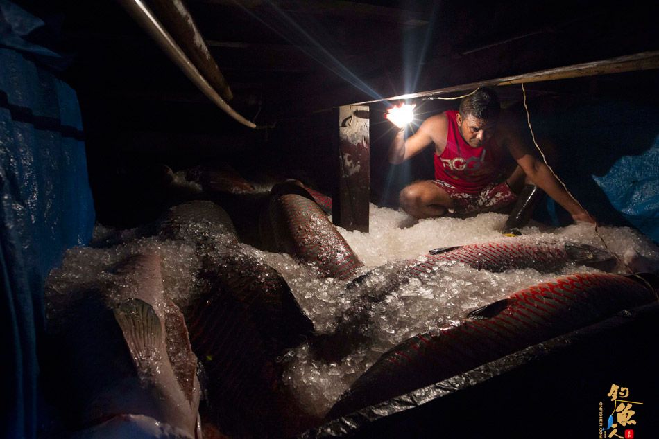 伯托-诺沃村的一名村民正在查看白天在伯克-福多湖捕捞的巨滑舌鱼。为了保鲜,当地村子会在船上准备大量碎冰块。