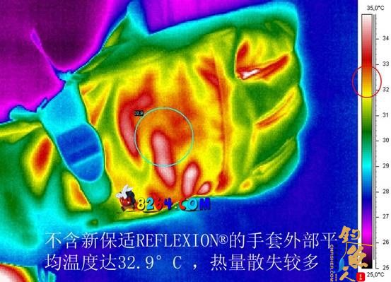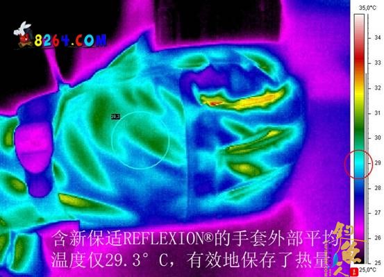 实验室里,在红外线相机照射下呈现出来的图像显示:含有新保适REFLEXION(R)薄膜的手套,热量被反射并保存在了手套里面,表面温度仅29.3°C,而不含新保适REFLEXION(R)的手套,红外线反射很少,热量大量散失,表面温度达32.9°C,二者相差3.6℃。也就是说含有新保适REFLEXION(R)薄膜的手套将这3.6℃保存在了手套里。(如下图)