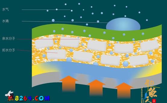 新保适(Sympatex)薄膜中,亲水物质对水蒸气的吸附是双向的,它既能吸附来自身体的水蒸气,也能吸附来自外部环境的水蒸气,但是,对外部环境中水蒸气的吸附是微乎其微的,温度与湿度差决定了水蒸气的总体流向是向外的。