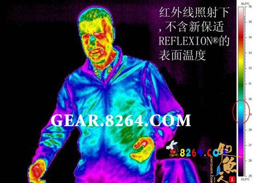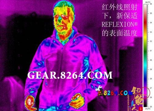 (众所周知,身体的红外线散失越厉害越不保暖。根据EMPA的实验室测试,新保适REFLEXION(R)可以反射75%的红外射线,试想在在户外零下五摄氏度的情形下,穿着比普通风衣内部温度高4度的REFLEXION(R)产品是何等舒适。)