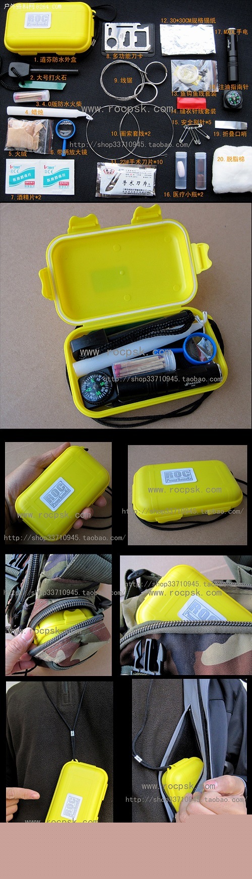 本标准配置为经过长期野外实践反复推敲精心搭配的,外盒小巧附带挂绳方便携带防丢,外出驴行请切记随身携带!!里面物品分类20样,提供了极端恶劣条件下的生火,渔猎,求救等方面的援助,能在你被困时候给到你最大的帮助。里面物品的使用方法可见www.rocpsk.com(请复制到浏览器中打开!)中有视频及文章图片介绍!希望能让你更安全更快乐的享受户外运动带来的乐趣!