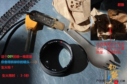 一般情况下很少人外出会带火石,除非你是户外玩家。但是外出游玩带个相机是非常平常的事,下面就介绍一下怎样使用相机的部件生火。凸透镜具有聚光的作用大家都知道,让镜面与光线垂直,漫漫地调节镜片与纸距离,使光斑最小,最亮,不久你就会发现纸被烧出个洞。把相机的镜头拆下来做临时的生火工具,关键看你是不是舍得。