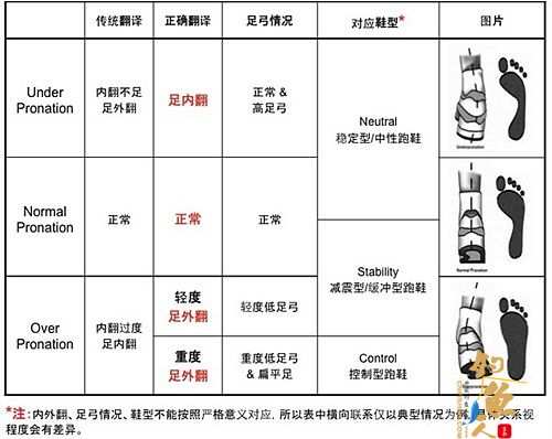 对于其中文理解,有一种翻译是这样的:NormalPronation,正常;OverPronation,过度内翻;Under Pronation,内翻不足,这个翻译可以理解为英文直译,但是以更为常用的“内外翻”说来看,这个“不足、过度”的翻译非常不直观,很容易让人不知所云。