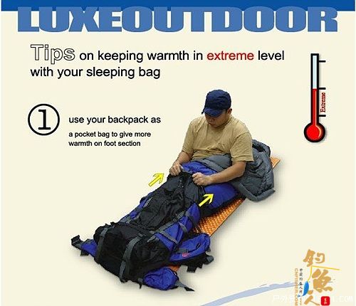 1.背包套脚这方法不在必要的时候,最好不用,因为在寒冷的时候,会造成大量水汽凝结在包里,打湿睡袋。