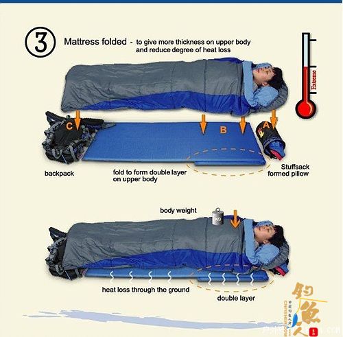 3.适合垫子保暖不够的驴子,许多新驴用的2cm厚充气垫,冬天在泥地或水泥地上扎营,那滋味是不太好受。像这样把垫子折过来,背部保暖会好很多,再用背包垫脚,能凑合一晚了。冷天的时候,把垫子适当吹涨点,保暖会好一些,不过你垫子质量不好的话,别使劲吹。