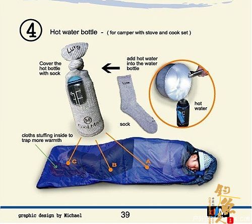 4.终极保暖大法,所谓开源节流,上边3条都只是节流,尽量减少热量流失,第4条就是开源了。脚是最容易冷的部位,烧个暖水壶放在脚底,夜里会舒服很多,早上起来还有温水喝,有洁癖的mm可能接受不了,不过你看看人家Bear尿在水壶里抱着睡,应该心里能平衡了。此法仅限单层水壶,保温瓶无效,矿泉水瓶会烫坏,脉动一类的运动饮料瓶子也可以用。另外还有个办法是带暖宝宝,质量合格的暖宝宝还是很强大,能发热一晚上,半夜甚至烫脚,我们常笑言背一包暖宝宝,睡袋都可以带薄点。不过千万别买到存货,这玩意放上一年,发热量大减,另外重量也比较重,一个貌似有200g。