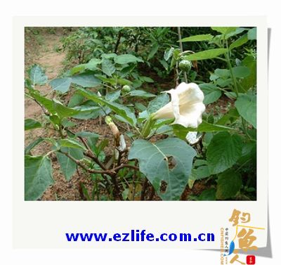 花:大,15厘米,近喉直8厘米,白色,腋生,生;萼色,5-6厘米。