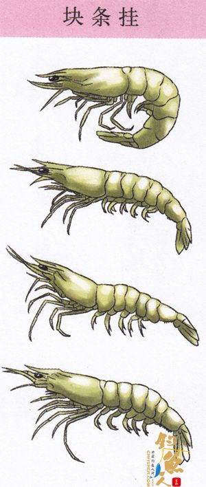 取一大活虾,去掉虾壳,从虾肉的中间剪开,再剪成块或小条挂于钩上。块条挂主要用于手竿钓鲤鱼。