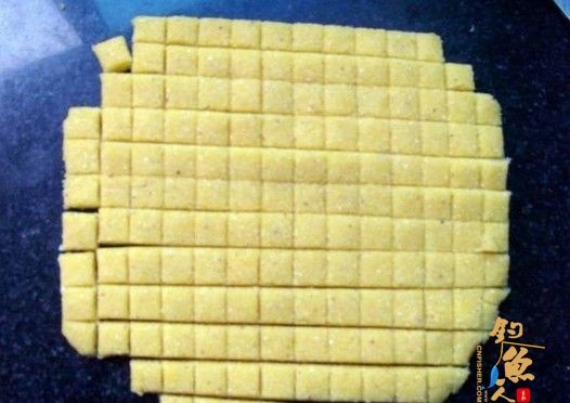 取玉米粉800克、白糖100克,加入适量的开水,搅拌成糊状,取锅一口,放入清水,锅内放上蒸菗,垫上纱布,将搅拌好的玉米粉放在纱布上摊成1.5公分厚,蒸八成熟,蒸熟后取出到入盆内,加入蜂蜜,乘热反复搓揉上劲,然后将玉米面团放在台子上压成1公分厚,用刀切成1公分方的小块,撒上多余的玉米粉,用马夹袋装好,再用口喷上少量的曲酒密封,一款纯天然玉米香味浓郁的钓饵就完成了。