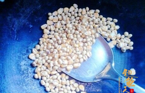 1、玉米和大豆在锅内加热炒至八成熟(加热中不断翻动,避免炒糊,能闻到香味,大豆变咖啡色就可以了)