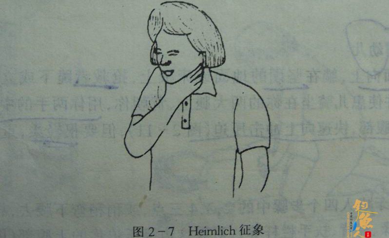 病人被食物和异物卡喉后,将会用一手放到喉部,此即Heimlich征象。