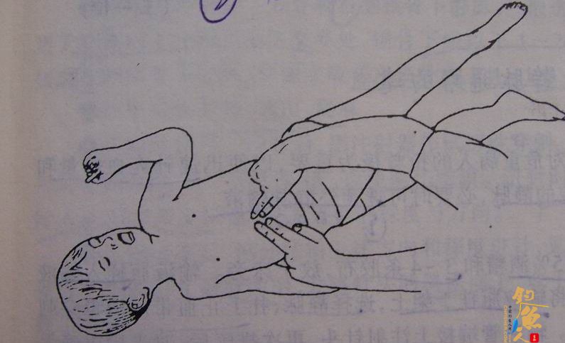 使患儿平卧、面向上,躺在坚硬的地面或床板上,抢救者跪下或立在其足侧,或你取坐位,并使患儿骑坐在你的两大腿上、背朝你,用你两手的中指和示指,放在患儿胸廓下和脐上的腹部,快速向上冲击压迫,但要很轻柔,重复之,直到异物排出。