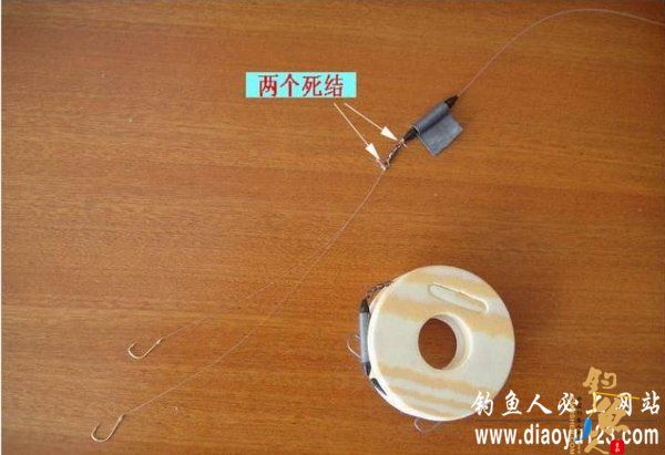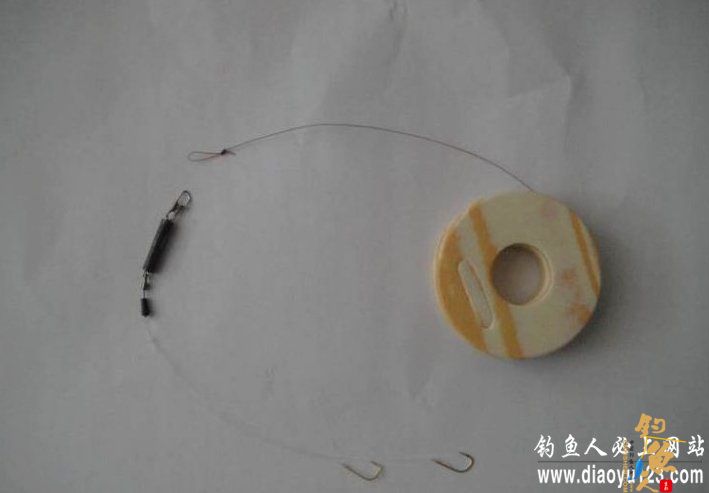 这是目前广泛使用的钩,线,坠组合方法。8字环两端两个死结,收线时坠,钩一起卷入储线盘。8字环,铅皮边缘,特别是钩尖和倒刺,极易划伤主线留下隐患。难怪有人问:我这么好的新线,怎么没多大拉力就断了?肯定有划伤。把细节做到极致,少出遗憾。