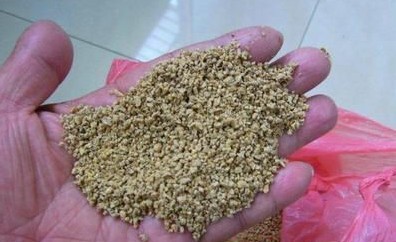4、 把小鸡饲料捣烂,兑入5%的面粉,兑入10%的面筋粉滴几滴香精用于台钓的搓饵;