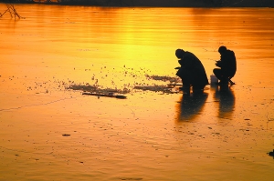 夕阳、冰面、钓鱼人构成了一幅美丽和谐的图画,成为冬季里一道美丽的风景线。
