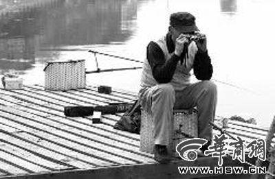 老人姓刘,是河对岸红旗厂的职工,钓鱼是他最大的爱好。面对旁观者惊讶的表情,刘师傅笑着解释道:“我视力不好,眼睛患有严重的散光,浮漂在水里一晃一晃的,单凭肉眼看不清水里的鱼有没有咬钩。”刘师傅说望远镜本来是孙子的玩具,钓鱼的时候就成了他的“超级装备”,非常管用。