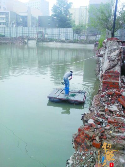 长春市民陈先生11日8时许经过北安路时,看到的别样风景让他忍不住停下脚步。陈先生说的位置就在北安路上曾经的一处地下停车场,两年前被拆迁后留下了一个长方形的大坑,而今竟成了波光粼粼的水塘,水面上一名30多岁的男子站在一个自制的简陋筏子上用渔网不断地从水中捞出死鱼。陈先生凑近观察,发现水里有不少鱼,水深少说也有两米,经打听,年初的时候还有人向水塘里投放了3000多斤鱼苗。