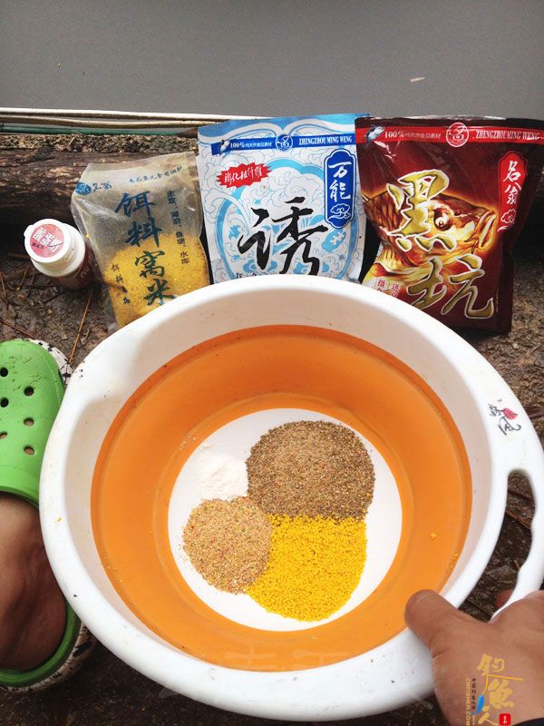【饵料】:名翁黑坑2份+万能诱1份+饵料窝米0.5份+酸蛋奶(少许);饵水比:1:0.8