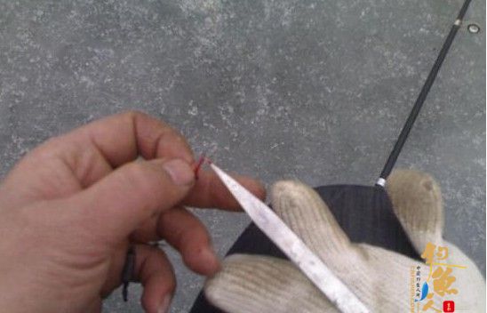 用左手拇指和食指指甲牢牢夹住钩柄,{用指甲固定鱼钩不容易晃动,利于配合血虫的上钩,}钩尖向内,中指伸出托住右手夹着血虫的镊子 ,{如果不用中指托住镊子,两只手和不到一起,干这精细的活,两手会颤抖不止,很容易使虫子体无完肤,自己崩溃……}右手用镊子夹住血虫的尾部,往钩尖上穿虫子,就如同在给钩子穿一条血红的裤子!记住钩尖尽量只在血虫上扎一个洞,不然血液外流,下不了两次水,虫子就成了无色无味的了。