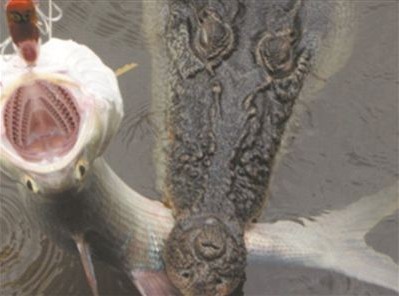 近日,澳大利亚一名渔民完成了他人生中极其惊险的一次垂钓。当他正准备收竿、将猎物拖上船时,却无比惊骇地发现一只巨大的鳄鱼竟也死死地咬住了他的战利品,而这一切就发生在距离他半米左右的地方。