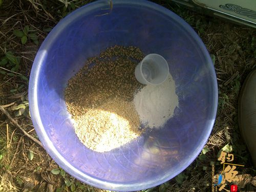 2:开一团干散饵分为二半。一团加上要用的小药,量一定要大,大约是说明的十倍到二十倍之间。药酒我会用到一瓶的3分之一。