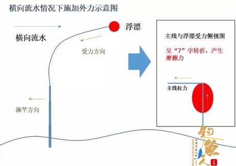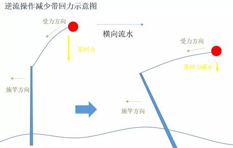 这一角度解决的入手点就是通过操作手法的改变使得我们能够逆着水流而不是垂直水流拖带钓组,这样的话主线对浮漂的受力方向就会趋近与横向流水同水平,那么主线对浮漂施加的拉向岸边的带回力就会减少了;