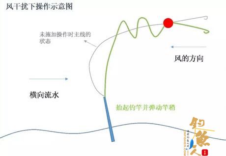 (1)风同流水逆向,此时会出现主线被风吹着向左方移动,而钓组会随着水流向右方移动,从而使得主线在水面上产生一个大弧形,并将钓组往岸边拉动,同时可能出现钓饵无法达到钓棚深度的情况;此时应当大幅度抬起钓竿,将主线提离水面后紧接着在主线接近于海面的同时弹动竿稍,使接近于浮漂的主线呈蛇形弯曲,从而达到利用主线牵制力减缓浮漂乘流速度的目的;