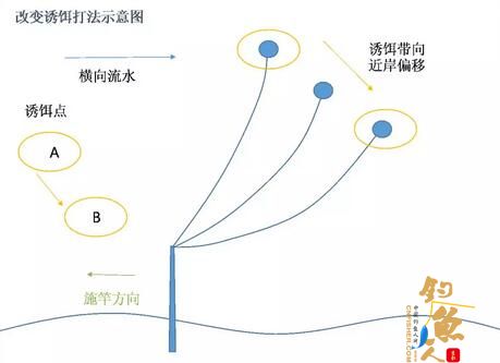 如下图,先在A处打下诱饵,然后在距离A点的远岸处抛下钓组,并操控钓组向岸边靠近,再根据流速在原诱饵点A点的近岸处、下游方向B点再打一次诱饵,这些诱饵最终会到达比第一次更近岸、更远的流尾方向,这样就可以形成一条逐渐靠向岸边的诱饵带,这样钓饵和诱饵就可以实现同步了。