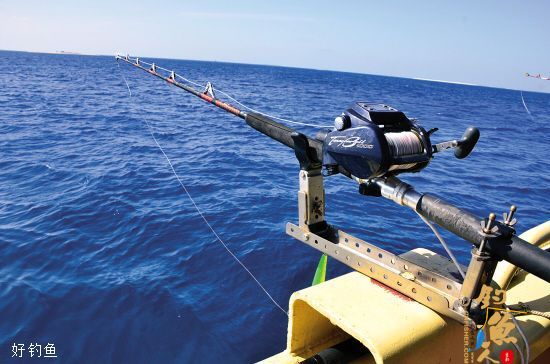 c.操作技巧:可事先组装好多组钓组,并准备相应数量的鱼竿,一一地将钓组抛投入海,然后一边开船一边放线,放50m左右合上抛线环,把竿插在船尾的固定座开始拖钓,再将鱼竿分散插在船尾的竿洞中,切记鱼竿之间的距离不可靠得太近,否则容易出现不同线组缠绕的情形。