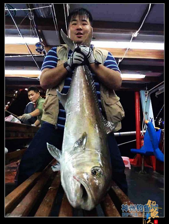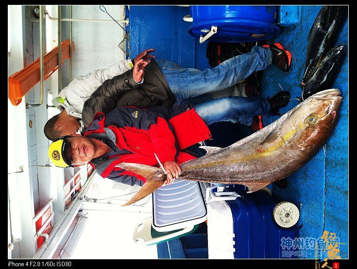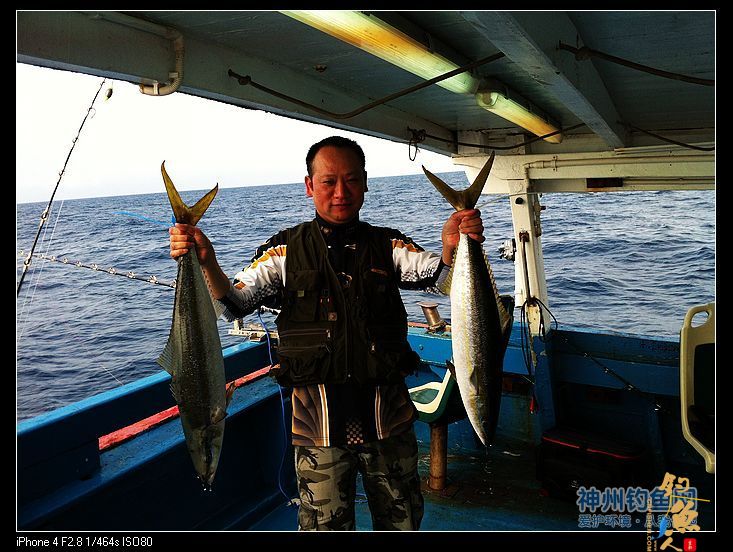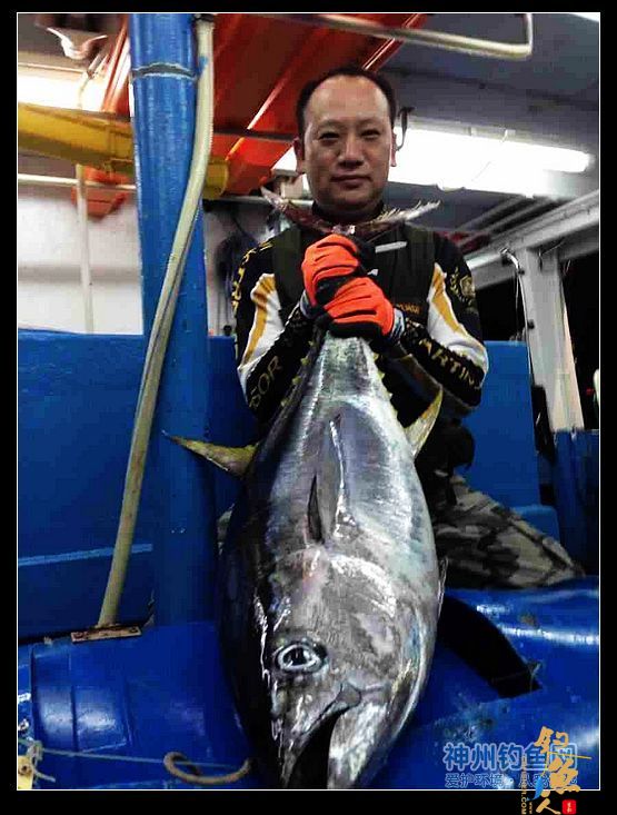 漂亮的黄鳍鲔。鲔鱼是学名,香港人叫吞拿鱼,通俗叫金枪鱼,最高时速达160马。上钩后的冲力可想而知。