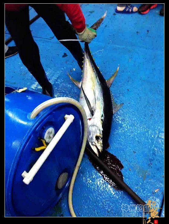 钓上的金枪鱼放血是重要步骤。在尾部第三个三角形尾鳍处割一刀,这里是金枪鱼大动脉。再在鱼腮处刺一下。一般鱼是冷血的但是金枪鱼是温血的。放干净血的刺身才好吃。