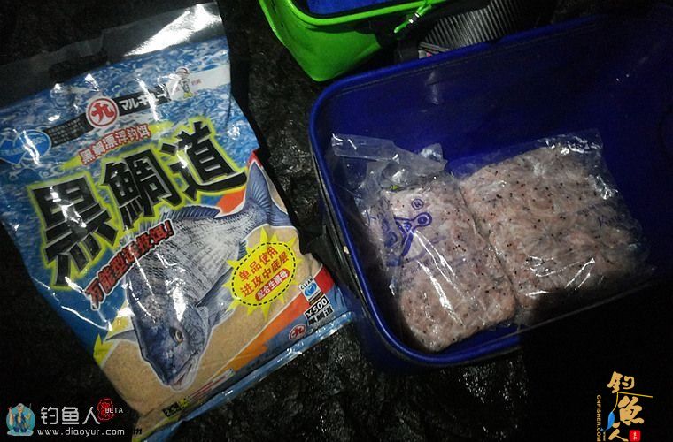 这是我们的窝料,1包黑鲷道和2块虾砖。搅拌在一起用打窝勺打窝。钓饵用的是沙蚕。
