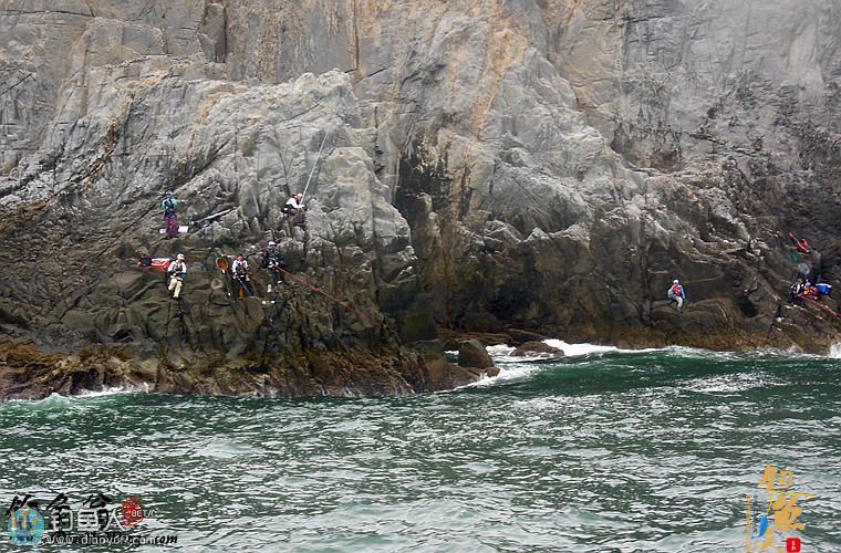 在这个地方,钓了近3小时,连潮水涨起来了,鱼情似乎也不好。于是打电话给船老大来接我们,换个地方试试。下面就请大家欣赏一下真正的勇者!至少我是佩服的五体投地了!感觉这些人,更像是一只只蝙蝠吸附在湿滑的礁石上在钓鱼......